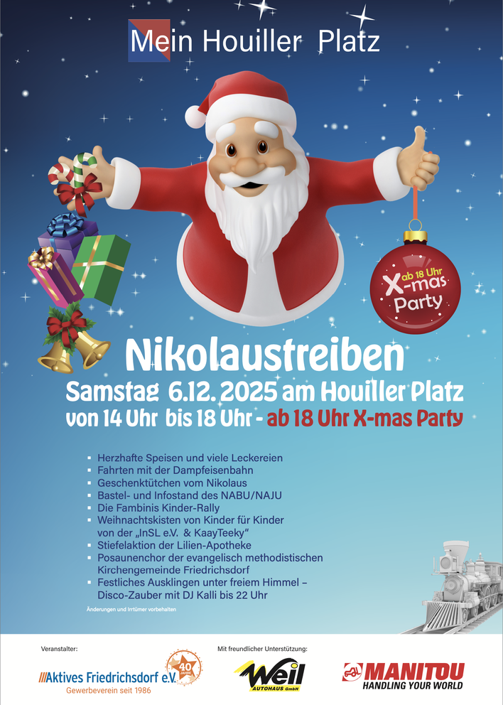 Von 14 bis 18 Uhr genießen Familien ein buntes Programm mit der beliebten Dampfeisenbahn, Mitmachaktionen des Familienzentrums, NABU/Naju und der InSL e. V., sowie über 700 liebevoll gefüllte Geschenktütchen, die vom Nikolaus höchstpersönlich an die Kinder übergeben werden.